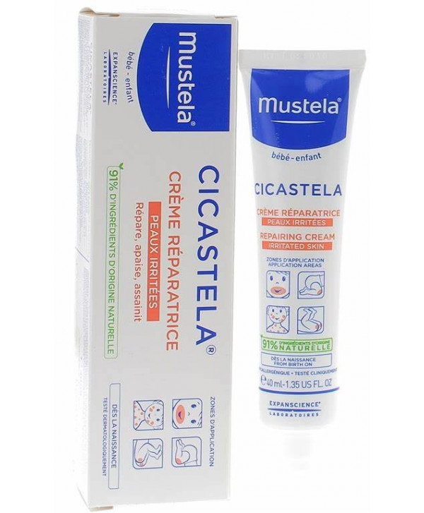 Mustela Cicastela Crème Réparatrice Peaux Irritées 40 ml est une crème qui répare, apaise et assainit tous les types de peaux irritées des nourrissons (par exemple l'eczema). Elle peut s'appliquer dès la naissance sur les irritations superficielles du quotidien et rougeurs localisées : contour de la bouche, dartres, plis, siège, éraflures, traces de varicelle, piqûres d'insectes. Elle favorise une réparation cutanée de qualité grâce à l'Acide Hyaluronique, elle apaise immédiatement et durablement avec le Panthénol, elle assainit l'épiderme avec le Cuivre et le Zinc, elle protège la barrière cutanée et préserve la richesse cellulaire de la peau avec la Perséose d'Avocat. Elle laisse un film protecteur non gras et non collant. La peau retrouve souplesse et confort. Elle ne pique pas et offre une haute tolérance cutanée.