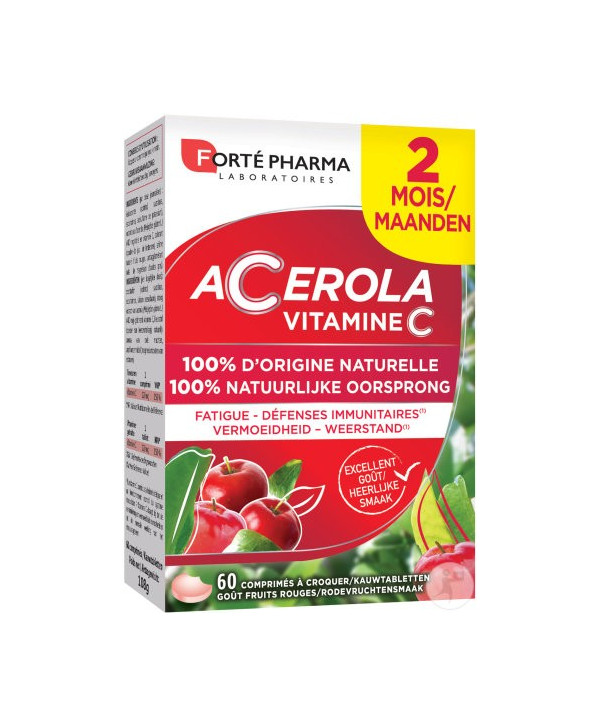 Forté Pharma ACÉROLA Vitamine C est un complément alimentaire de vitamine C d'origine naturelle provenant d'un fruit, l'ACÉROLA, connu par sa richesse en vitamine C. D'une part l'acérola présente une source 100 % naturelle de vitamice C et d'autre part il contient des métabolites qui améliorent son assimilation et donc l’absorption optimale de la vitamine