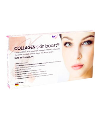 COLLAGEN SKIN BOOST™ est ultra concentré en collagène et en acide hyaluronique. Résultat : la peau est lissée et repulpée, les signes de l’âge sont réduits. Il est également enrichi en vitamine C qui contribue à la formation normale de collagène pour assurer la fonction normale de la peau et en vitamine E qui contribue à protéger les cellules contre le stress oxydatif grâce aux vitamines A, C et E.