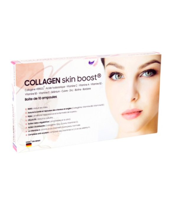 COLLAGEN SKIN BOOST ™ permet de restructurer et rééquilibrer la peau pour l’assainir et la purifier. Ce complément alimentaire, à base de plantes dont la bardane, le zinc, la pro-vitamine A, stimule naturellement et efficacement les processus de détoxination et d’assainissement de la peau.