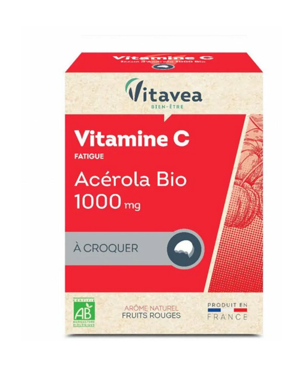 Vous vous sentez fatigué, en manque de tonus, et rencontrez des difficultés pour affronter votre quotidien ? Liée au surmenage, à un effort physique intense, à des troubles psychologiques, ou encore au vieillissement, la fatigue touche un grand nombre d’entre nous. Elle est parfois seulement passagère ou réactionnelle, et dans ce cas, la vitamine C est votre meilleure alliée pour apporter la dose d’énergie dont votre organisme a besoin. Pour cela, Vitavea a mis au point un complément alimentaire Vitamine C pour vous aider à retrouver tonus et énergie. Pour vous proposer un complément alimentaire présentant de la vitamine C 100% d’origine naturelle, Vitavea a créé une formule à base d’acérola Malpigia glabra biologique. La « cerise des Antilles », comme on la surnomme, est un fruit naturellement très concentré en vitamine C au goût acidulé. Prise quotidiennement, la vitamine C contribue à réduire la fatigue et favorise le bon fonctionnement de nos défenses naturelles . Également appelée acide ascorbique, elle participe au fonctionnement normal du système immunitaire et favorise la résistance de l’organisme. Présente dans plusieurs fruits comme le cassis, la fraise, le kiwi et les agrumes, mais également dans certains légumes comme les brocolis ou les poivrons rouges, il peut être intéressant d’apporter une dose supplémentaire de vitamine C grâce à notre complément alimentaire à croquer si vous en ressentez le besoin. La vitamine C peut se présenter sous différentes formes : comprimé effervescent, acérola, comprimés à croquer ou à sucer. Chez Vitavea, nous avons choisi le format à croquer afin de vous permettre d’être plus libre d’adapter votre dosage. Un comprimé vous apporte plus de 100 % de la dose recommandée de vitamine C quotidiennement. Besoin d’une cure de boost ? 2 comprimés apportent 1000 mg d’acérola biologique. Retrouvez tonus et énergie au quotidien grâce à ce complément alimentaire contre la fatigue !