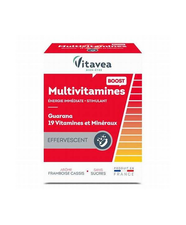 Multi'Vit Boost Vitavea Bien-être est un complément alimentaire qui contient des actifs reconnus et plébiscités pour booster l'organisme, renforcer le tonus et la vitalité et réduire la fatigue : vitamine C, magnésium, fer, guarana... Un cocktail de 12 vitamines et 7 minéraux.