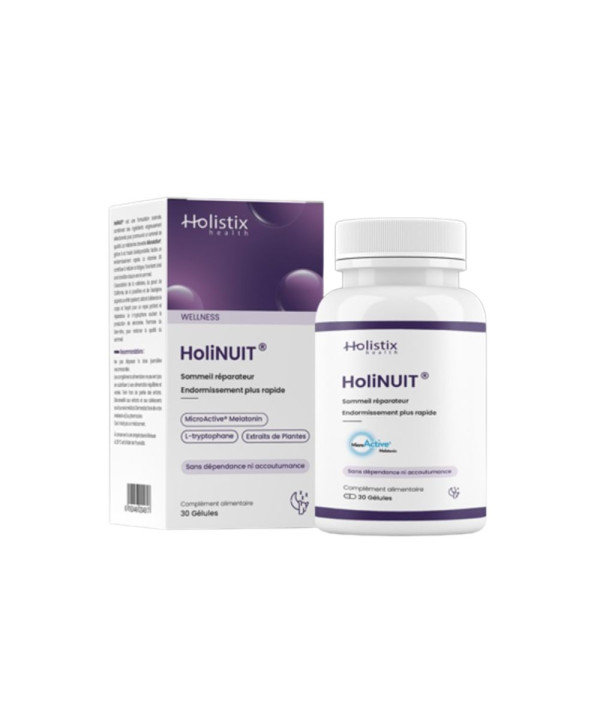 HoliNUIT, à base de Mélatonine à libération prolongée, efficace dès la première prise pour vous aider à vous endormir rapidement et prévenir les réveils précoces, garantissant ainsi un sommeil profond et réparateur toute la nuit.