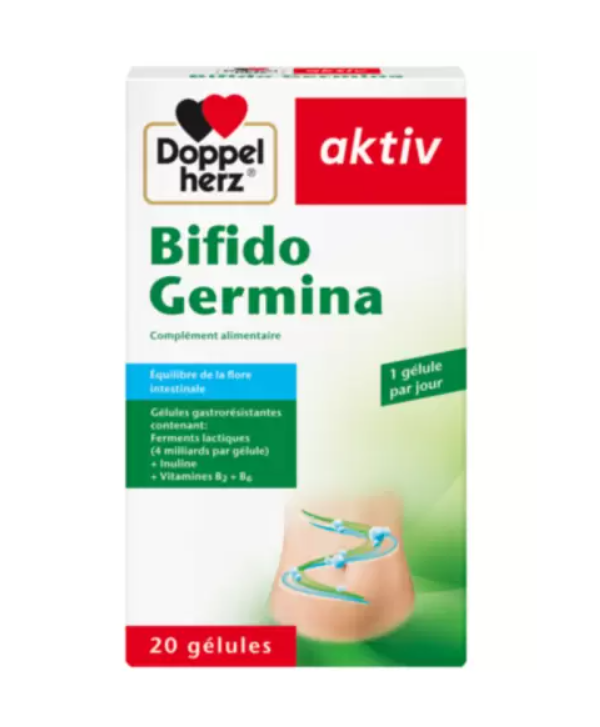 Les gélules Doppelherz Bifido Germina contiennent deux souches de Bifidobactéries et trois souches de Lactobacilles probiotiques qui ont été spécialement choisies pour : aider à régénérer une flore intestinale saine, notamment après la prise d’antibiotiques, soutenir un transit intestinal normal en cas d’irrégularités (constipation ou diarrhée), améliorer certains symptômes associés au côlon irritable.