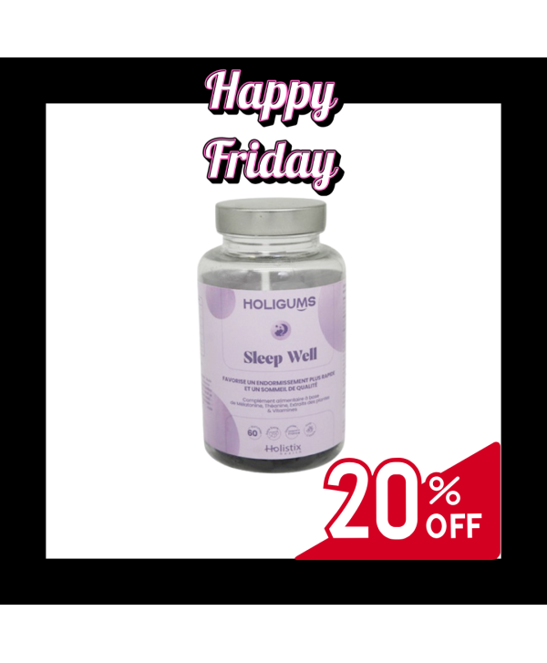 63,600 TNDRetrouvez des nuits sereines avec Sleep Well, des gummies spécialement formulés pour favoriser un endormissement rapide et un sommeil de qualité. Grâce à une synergie d'actifs naturels tels que la mélatonine (0,95 mg), la valériane (15,05 mg), la passiflore (15,05 mg), la mélisse (12,5 mg), l’aubépine (10 mg) et la théanine (25,25 mg), ce complément alimentaire aide à apaiser l'esprit et réduire le stress avant le coucher.