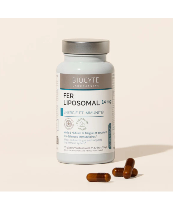 Le complément alimentaire Fer Liposomal de Biocyte est conçu pour soutenir l'énergie et le système immunitaire. Sa formule unique associe du fer microencapsulé, la vitamine C et la vitamine B12, offrant une synergie d'actifs pour une efficacité optimale. Le fer contribue à la formation normale de globules rouges et d'hémoglobine, essentiels pour le transport de l'oxygène dans le corps, tandis que la vitamine C améliore son absorption et la vitamine B12 participe à un métabolisme énergétique normal. Le fer microencapsulé utilisé dans ce produit est spécialement formulé pour une meilleure biodisponibilité, réduisant ainsi les inconforts digestifs souvent associés à la supplémentation en fer. Cette technologie innovante permet une libération contrôlée des actifs, maximisant leur efficacité. Fer Liposomal est idéal pour les personnes souhaitant réduire leur fatigue et renforcer leurs défenses immunitaires. Sa formule convient également aux végétariens et aux végétaliens, offrant une solution complète et adaptée à tous les régimes alimentaires.