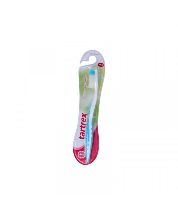 TARTREX BROSSE À DENTS ULTRA-SOUPLE est spécialement conçue pour les dents et les gencives sensibles. Les micros-filaments nettoient les tissus inflammés, sans les irriter.