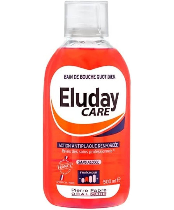 Pierre Fabre Oral Care Eluday Care Bain de Bouche 500 ml est un soin d'hygiène quotidienne avec une action antiplaque renforcée, adapté :