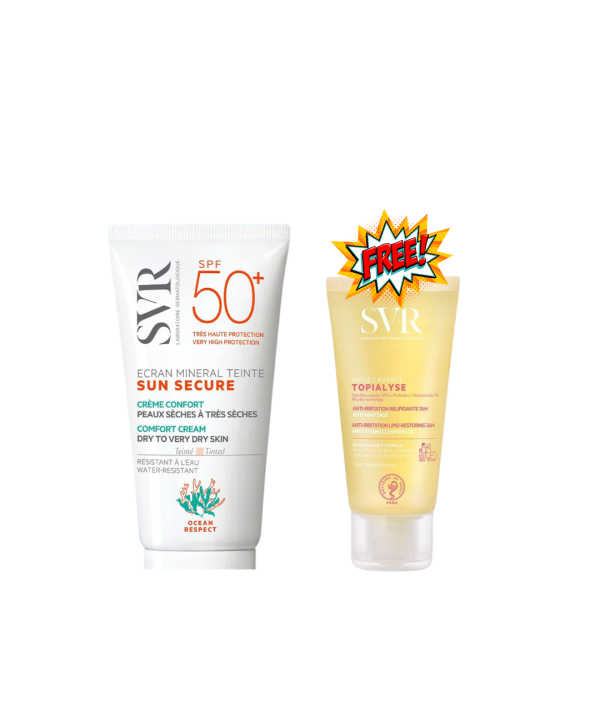 67,900 TNDSUN SECURE Écran Minéral Teinté SPF50+ est un soin très haute protection 100% minérale. Il convient aux peaux intolérantes mais aussi aux femmes qui souhaitent se maquiller au soleil toute l’année. Grâce à sa bonne couvrance, les imperfections sont camouflées, le teint unifié toute la journée. Il existe en deux versions : crème toucher sec peaux normales à mixtes et crème confort peaux sèches à très sèches.