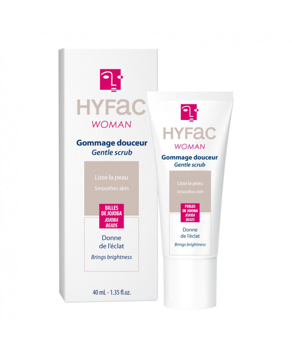 Le Gommage douceur HYFAC Woman détoxifie les pores et élimine les cellules mortes. Grâce aux propriétés exfoliantes naturelles des billes de jojoba et de la poudre es noyaux d'olive, la peau est douce et nette, sans être agressée. Le thé blanc estompe les rougeurs, réduit les taches.