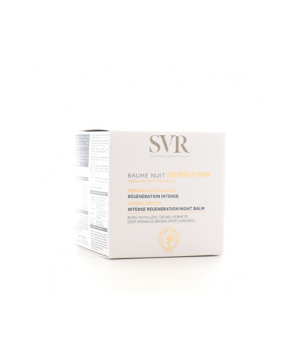 La formule du baume nuit Densitium SVR est composé d'acide hyaluronique ultra-fragmenté et de bio-calcium, permettant d'agir sur les rides profondes, de repulper la peau et de redessiner les contours du visage. La peau se trouve alors plus ferme et lissée. Enrichie également d’un duo d’acides aminés et de probiotiques, la peau est plus uniforme et lumineuse. Enfin, sa formule est composée de tetrapeptides pour une peau lisse et fraîche au réveil.