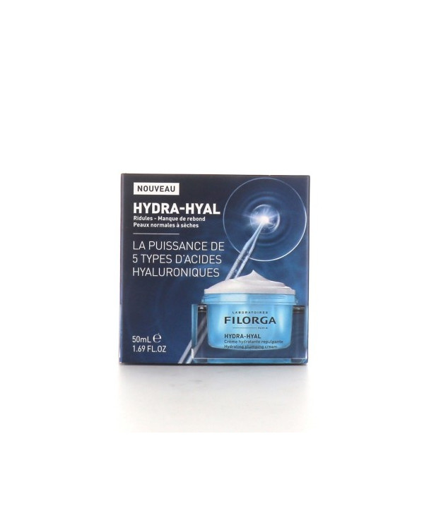 Dans la crème Hydra-Hyal, l'acide hyaluronique est d'origine végétale et présent sous 5 formes différentes : réticulé, encapsulé, bas poids moléculaire, moyen poids moléculaire et haut poids moléculaire. Cette pluralité permet une action sur l'ensemble de la structure de la peau. L'acide hyaluronique va hydrater, redonner du rebond à la peau et offrir une action lissante visible. Pour aller plus loin, Filorga a ajouté de la glycérine, chargée de sceller l'hydratation, et de l'huile d'amande douce pour le confort et la nutrition de la peau. La vitamine E préserve les cellules des attaques radicalaires et du stress oxydatif. Enfin, la vitamine B3 apporte ses propriétés anti-âge, anti-inflammatoires et régénérantes.