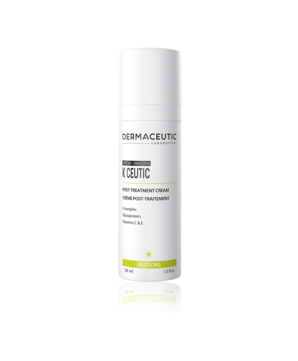 Crème post-traitement SPF 50 K Ceutic des Laboratoires Dermaceutic, restaure et protège la peau en lui apportant les nutriments nécessaires et une protection élevée SPF 50. Sa formule avancée offre une combinaison d’ingrédients conçue pour réparer, nourrir, protéger et apaiser la peau.