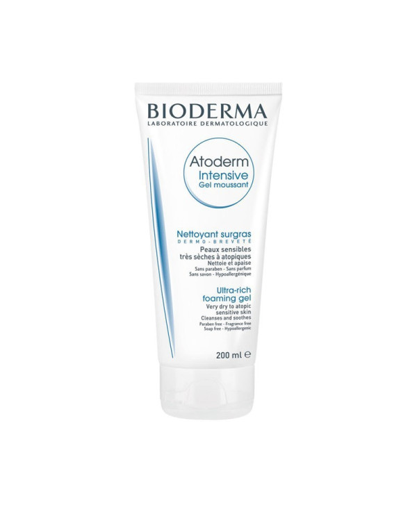 Atoderm Intensive Gel moussant nettoie en douceur, apaise les sensations d’inconfort et calme les démangeaisons des peaux très sèches, irritées à atopiques. La vitamine PP reconstruit et renforce biologiquement la barrière cutanée. La base lavante surgraissante sans savon et le pH physiologique respectent l’équilibre de la peau. Le complexe breveté SKIN BARRIER THERAPYTM*permet de limiter l’adhésion de certaines bactéries (staphylocoque doré) à la surface de la peau, qui peuvent être à l’origine de l’aggravation de la sécheresse cutanée.